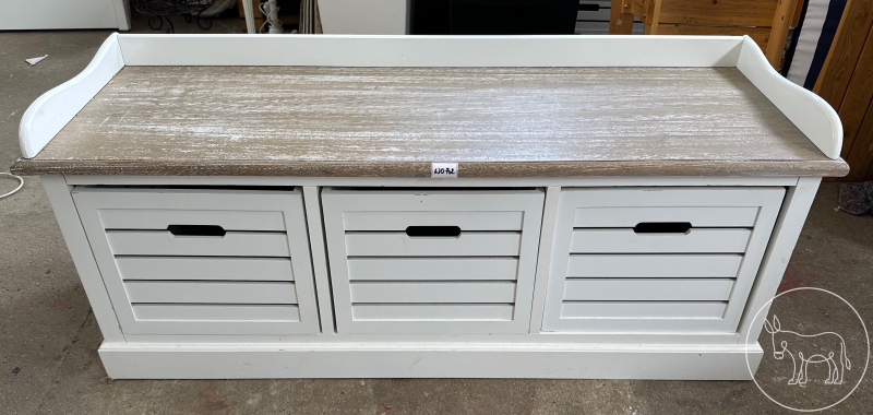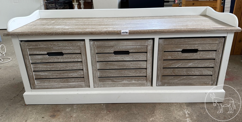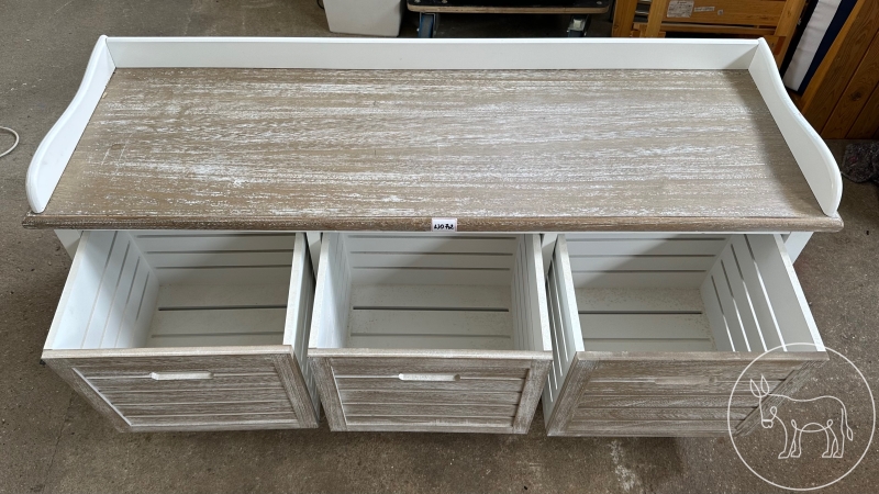 weiß/grau mit 3 weiß/grauen Schubladen (kann variiert werden). Maß: 120x40x50cm.
