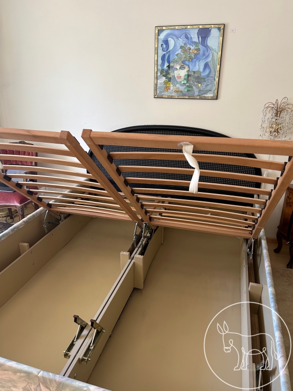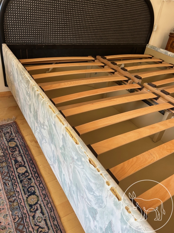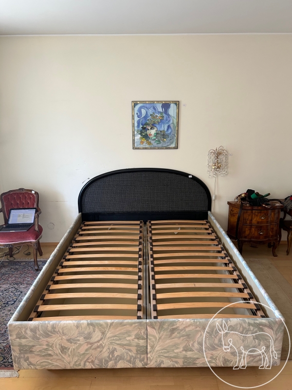 Doppelbett mit Kopfteil aus schwarzem Wiener Geflecht und Stoffbezogenen Seitenteilen. Bettzeugraum mit Kopf- und Fußverstellbaren Lattenrosten. Matratzenmaß 160x200cm. Rahmenhöhe 48cm. Kopfteilhöhe 103cm. Rahmen müsste neu bezogen werden.