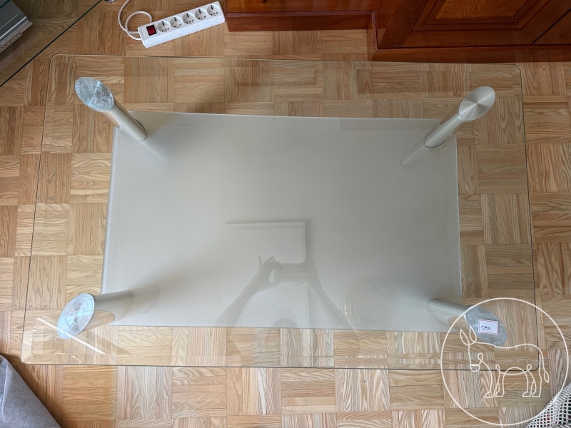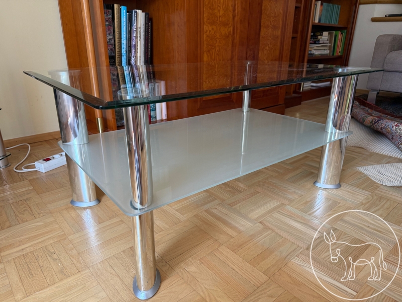 Couchtisch aus Glas mit silberen Beinen und einer Ablage aus Milchglas. Maß: 100x63x45cm.
