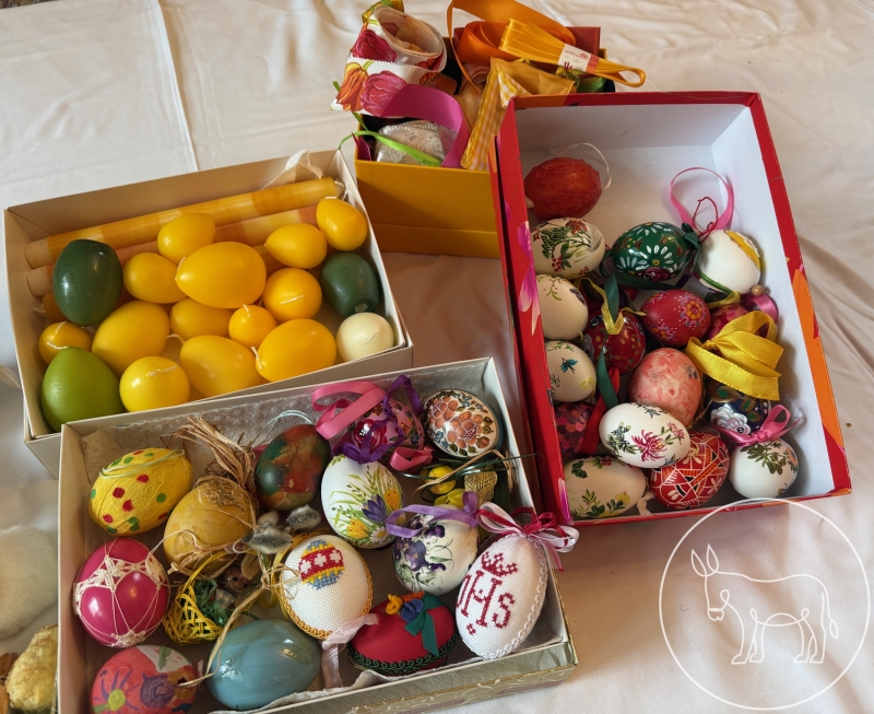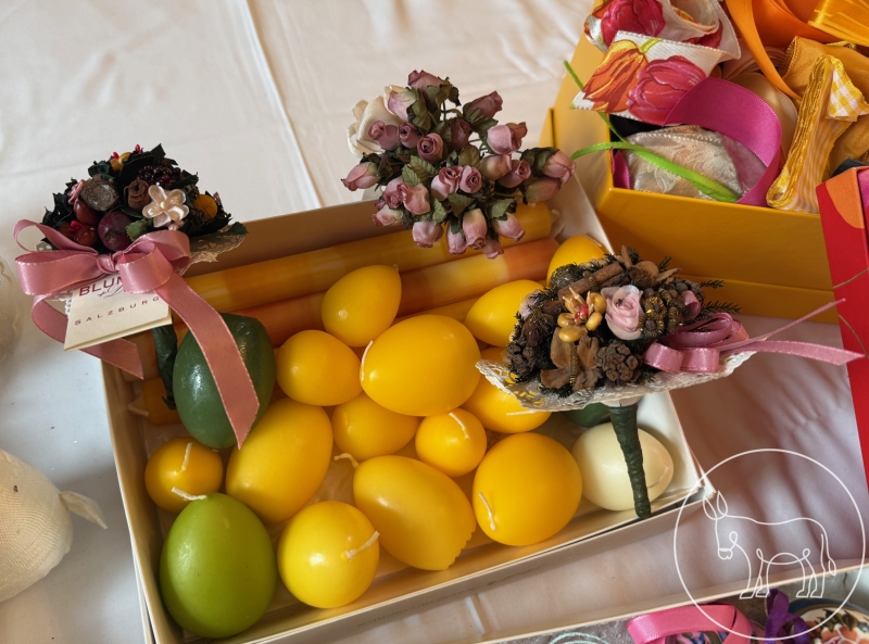 Oster-Konvolut: Handbemalte gestickte Ostereier, Osterdeko, Weihkorb-Deckerl, Osterkerzen, Gewürzsträußchen, etc.