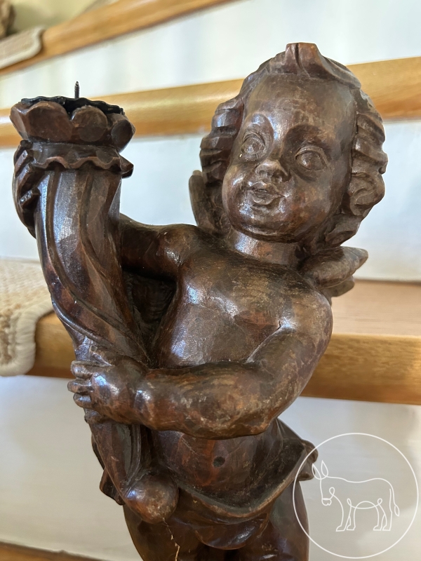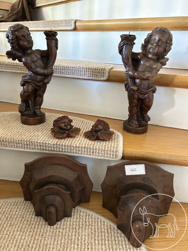 2 Holzengel, die eine Kerze tragen, 2 Wachsengel, 2 Holz-Wandregale