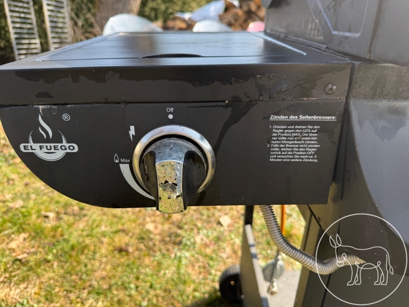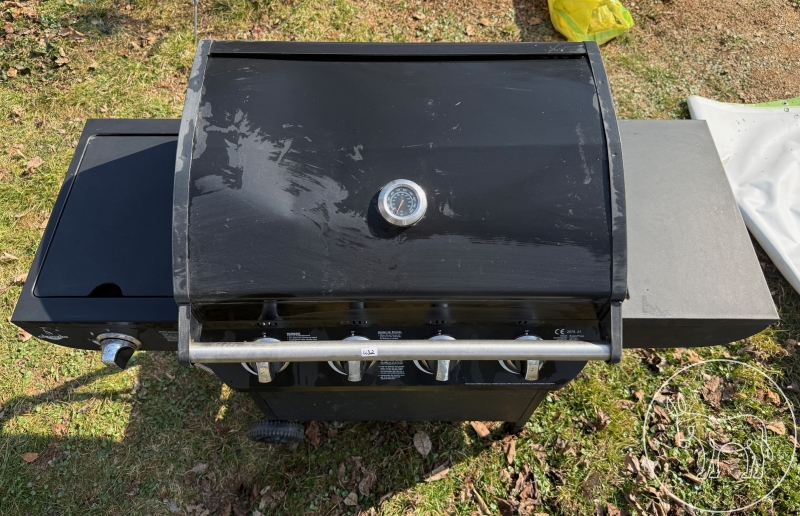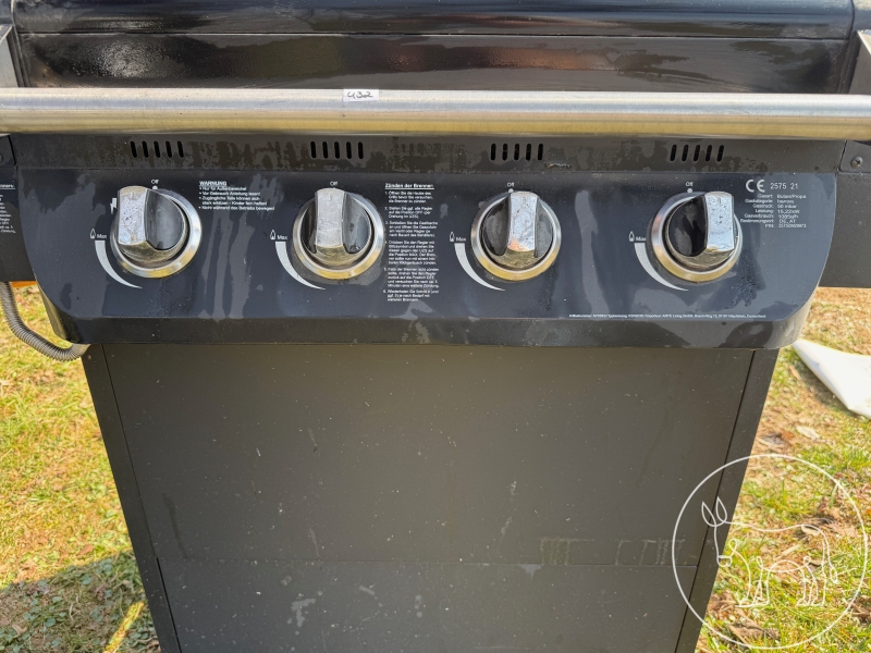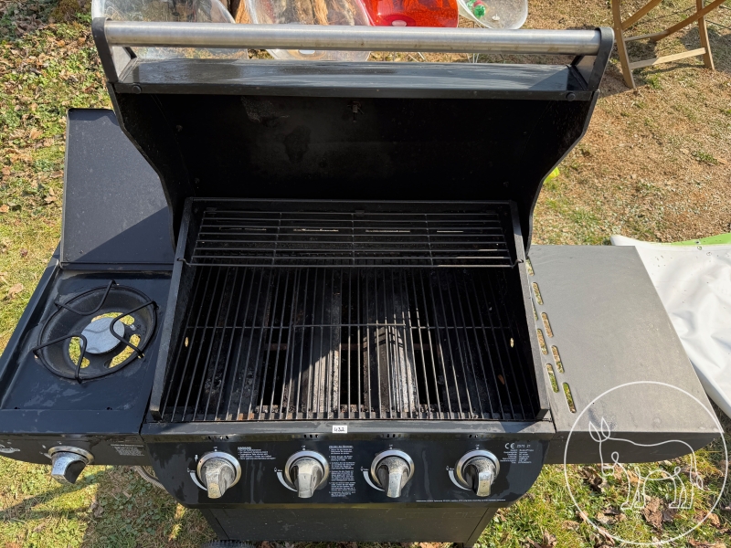 4 flammiger Gasgriller, mit Ablage an einer Seite und Gasherd auf der anderen Seite. Schwarz, Metall. 130x60cm. Maximale Höhe (geöffnet) 140cm. Inkl. Temperaturanzeige