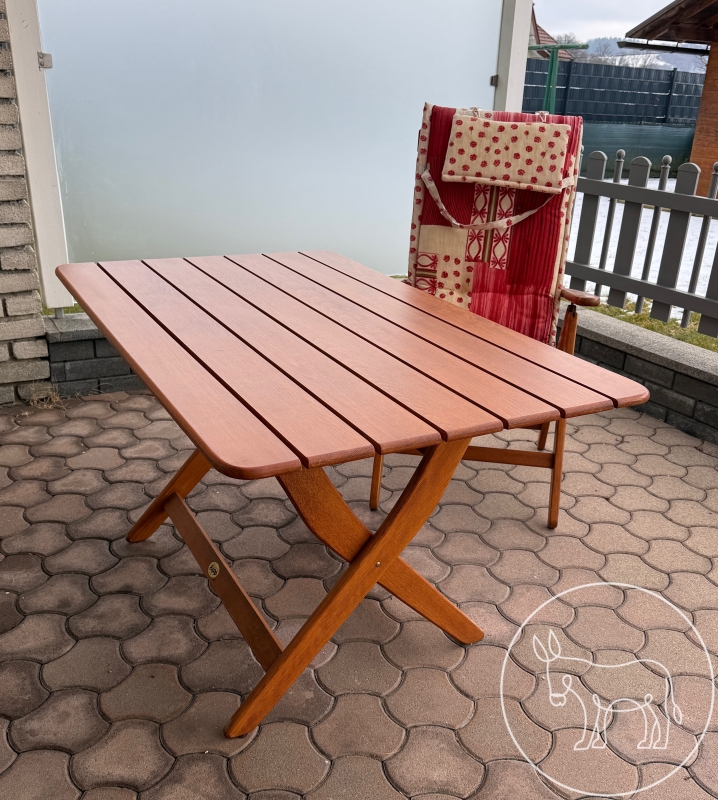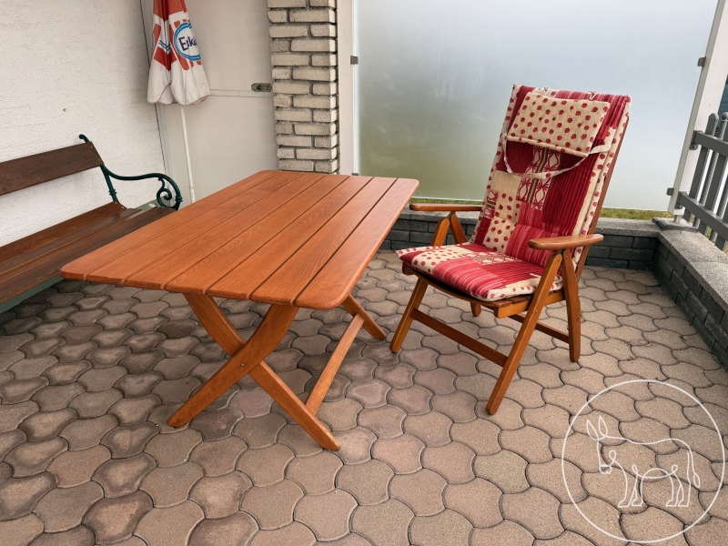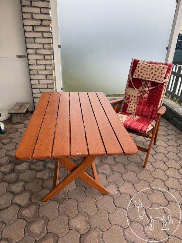 Garten- / Terrassentisch mit 6 Stühlen und 6 Sitzbezügen. Alles klappbar und gut verstaubar. Größe des Tisches: 136x80x72cm.