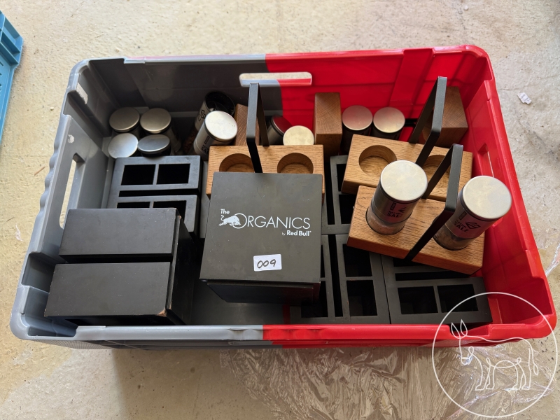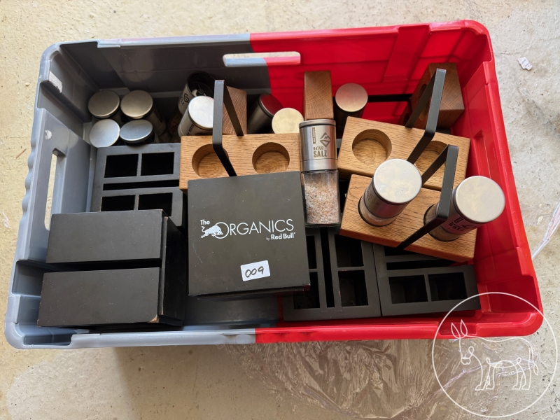 8 Stück Organics by Red Bull Besteck- und Serviettenhalter, 6 Stück Bad Ischler Natursalz Salz-und Pfeffer-Aufsteller inkl. Wanne