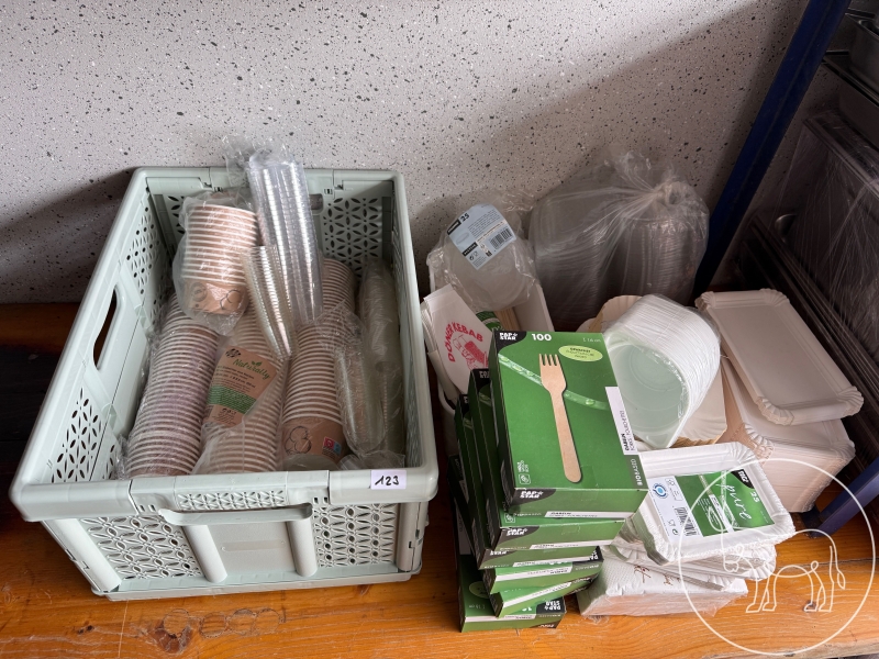 Eisbecher, Schnapsstamperl, Schaschlik-Spieße, Döner-Taschen, Suppentassen, Papierteller, 250ml. PET Behälter mit Deckel, Holzgabeln, etc.