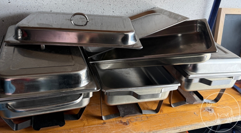3 Warmhalteplatten / Rechauds mit Untergestell (exkl. Brennpaste), Wasserwanne, Innenwanne und flache Platte, mit Deckel. Gesamtmaß: 56x36x37cm (inkl. Deckel)