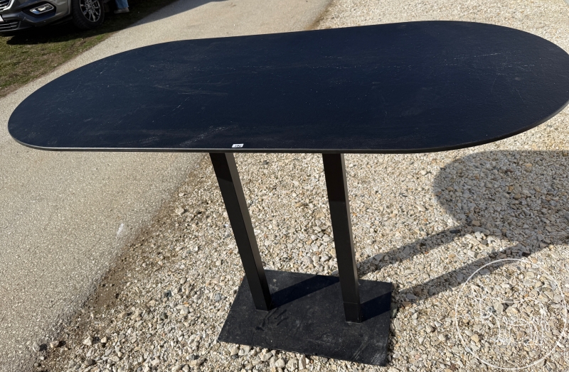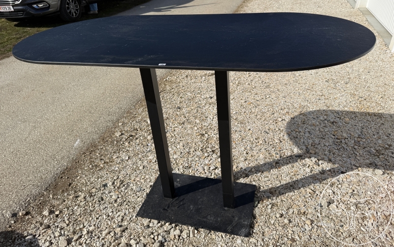 schwarzer Stehtisch oval mit stabilem, doppeltem Fuß, 163x80,5x113cm, Metall.