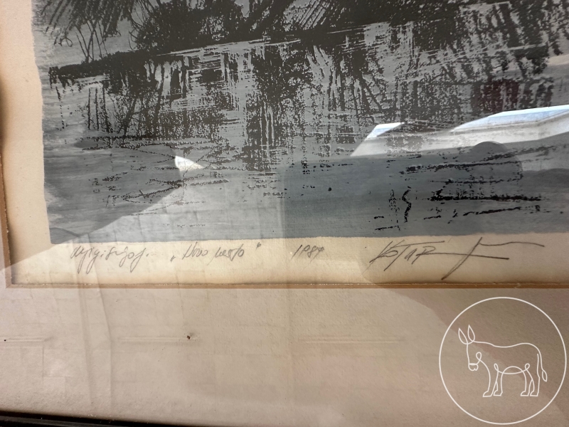 Lithographie "Novo Mesto" 1989 signiert "KOTAR", Dorf mit Kirche und Fluss, 1989, Maß 46x53cm