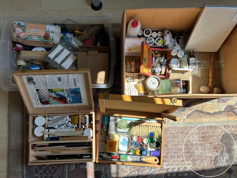 Diverse Utensilien zum Seidenmalen, Farbe, inkl. Spannrahmen etc.