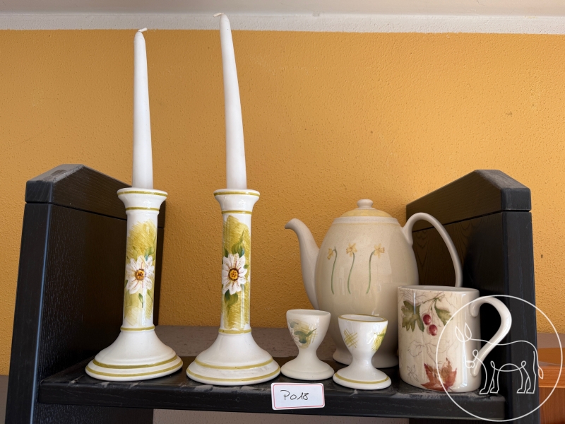 2 Kerzenständer, 2 Eicerbecher, 1 Tasse, 1 Teekanne