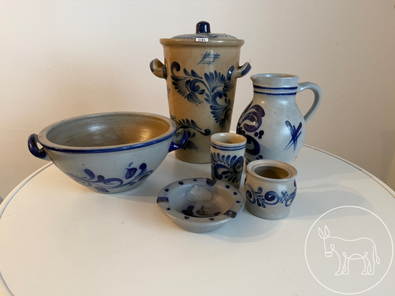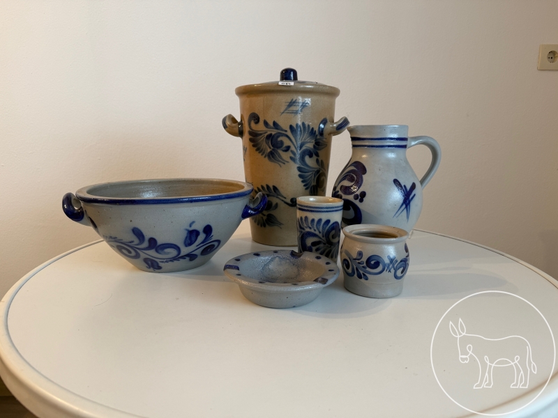 Sammlung von salzglasiertem Westerwälder Steinzeug mit blauer Bemalung. Weidling Maß: 31x13cm.