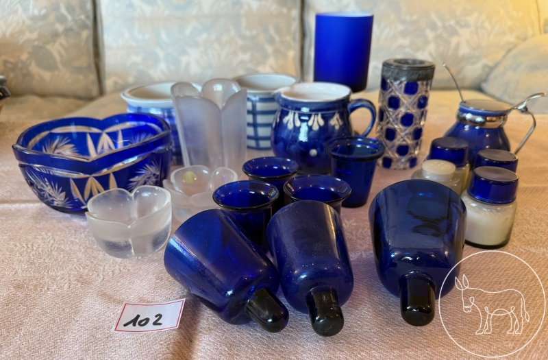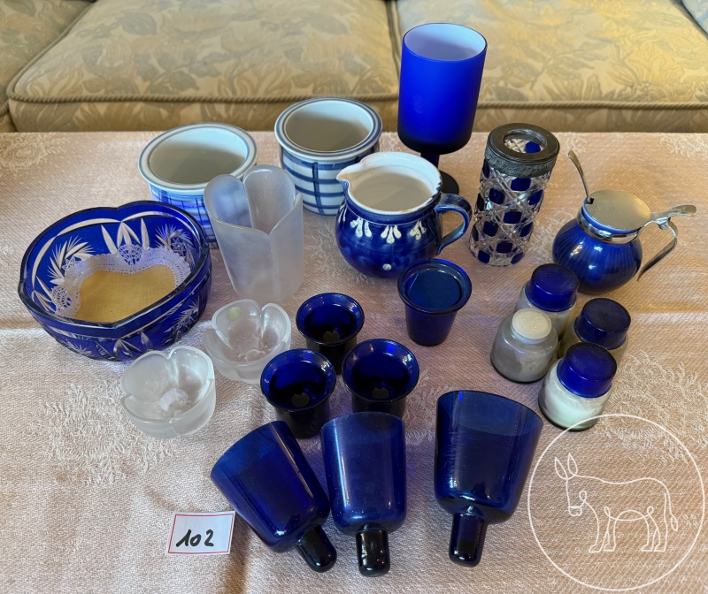 Konvolut an blauen Keramiken, Gläsern, Schalen, etc.