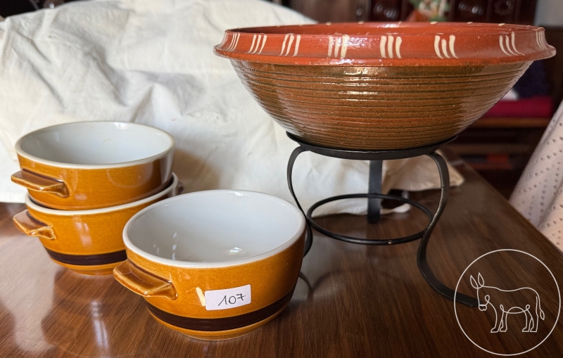 3 Suppenschalen D11cm und eine Schüssel auf schmiedeeisenem Ständer D22cm