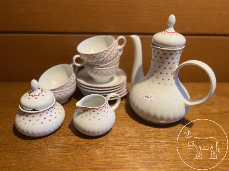 6 Tassen (Durchmesser: 9,5cm), 6 Teller (Durchmesser: 14cm), 1 Zuckerbehälter, 1 Milchkanne, 1 Teekanne