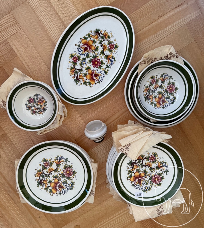 6 Fleischteller, 16 Desertteller, 2 Schüsseln, 3 kleine Schüsseln, 1 Servierplatte, 1 Deckel (Kanne fehlt).