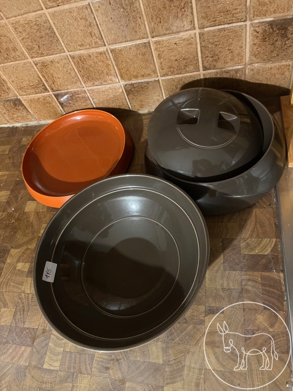 1 Teller (Durchmesser: 22,5cm), 1 Schüssel (Durchmesser: 25cm), 1 Schüssel mit Deckel (Durchmesser: 20,5cm)
