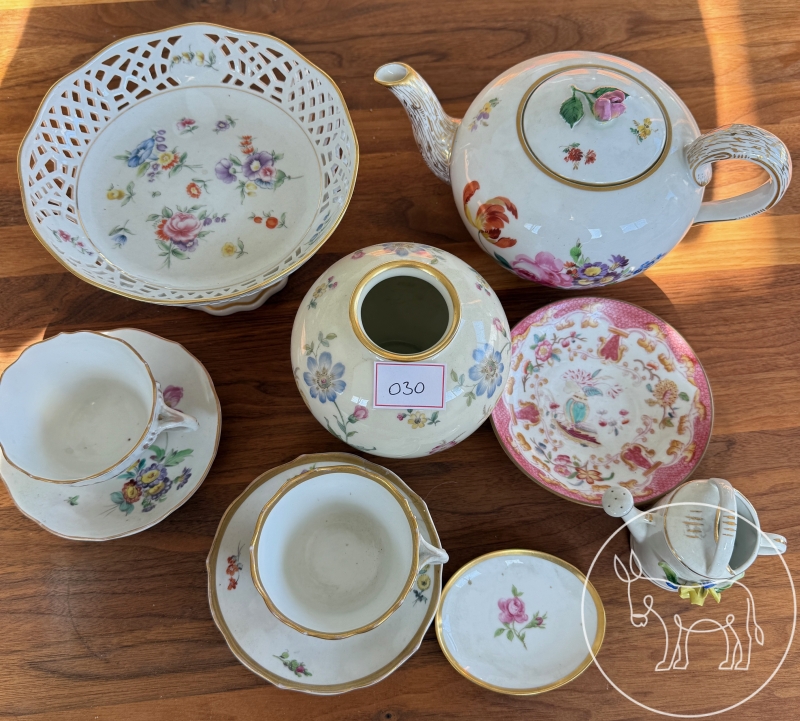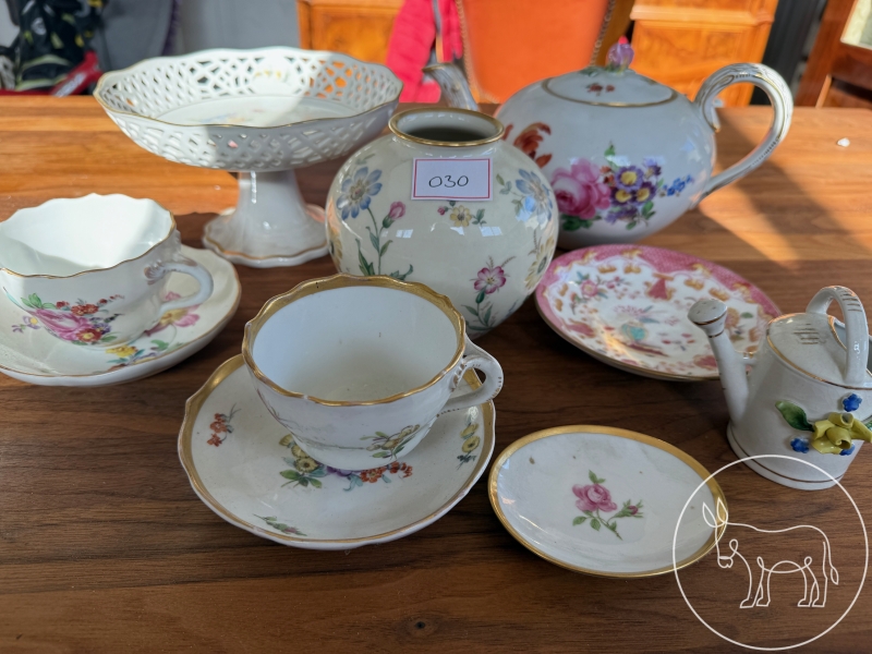 Teekanne, Vase, 2 Tassen mit Untertassen, Keks-Etagere, Tea-Tip, Mini-Gießkanne, kleiner Teller