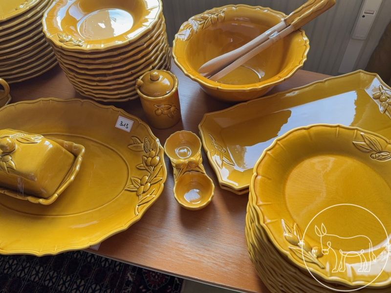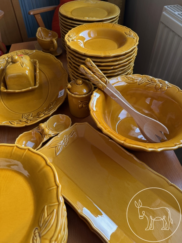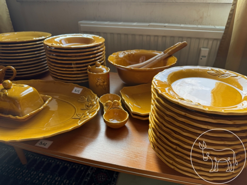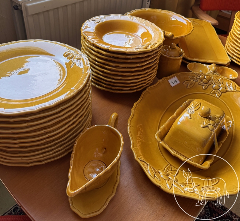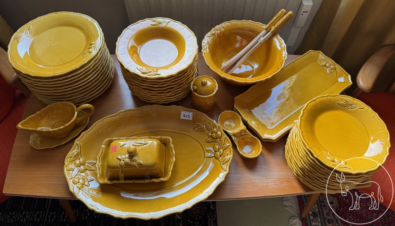 Geschirrservice besthend aus Vorspeisen-, Hauptspeisen- und Suppentellern. Eine große ovale Platte, 2 rechteckige längliche Platten, Salatschüssel mit Salatbesteck, Butterdose, Saucier, Salz/Pfeffer-Menage oder Dip-Schälchen, Chutney-Dose. Inkl. Tischtuch.