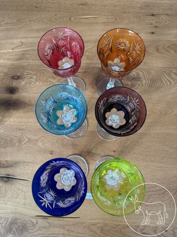 Set aus 6 handgeschliffenen Römer- Weingläsern aus farbigem Kristallglas (Bleikristall) mit aufwendigen Schliffen (Facetten) versehen, auf klarem Fuß.
