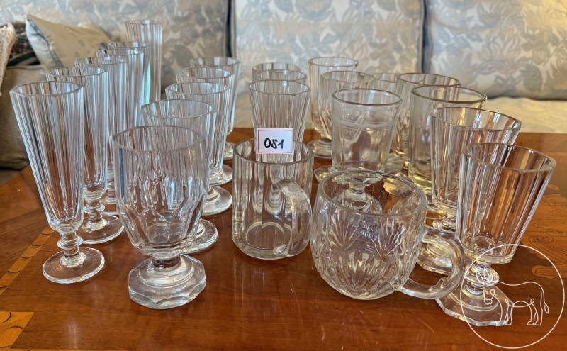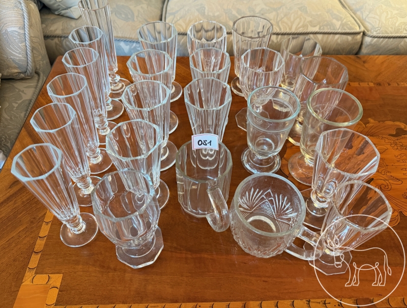 geschliffenes Kristallglas, teilweise oben schon abgeschliffen (wenn ausgeschlagen), daher teilweise unterschiedliche Höhen und Formen.