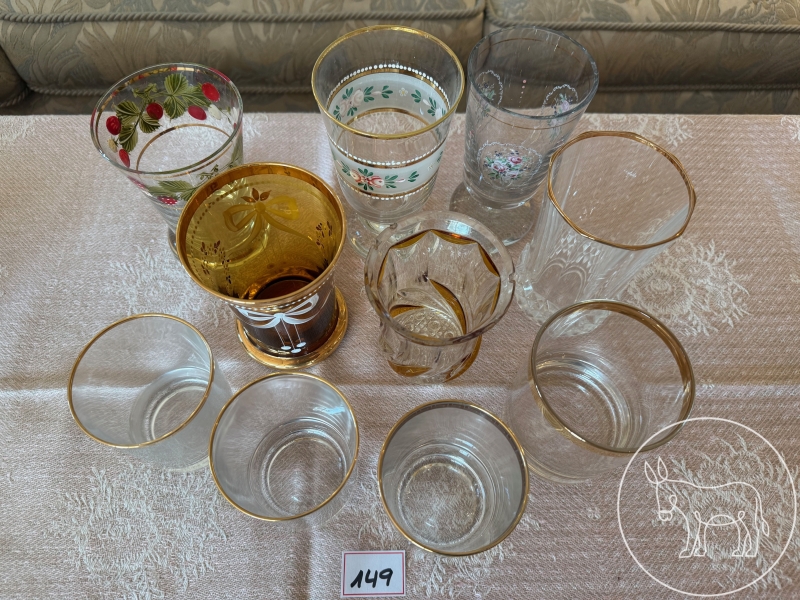 Teilweise geschliffene Gläser entweder aus gelbem Glas oder gold verziert in unterschiedlichen Größen und Formen.