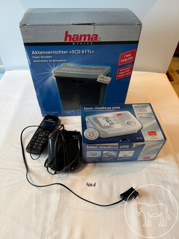 Schredder, Blutdruckmesser, Festnetztelefon.