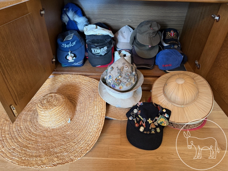 unterschiedlichste Kopfbedeckungen aus verschiedenen Ländern. Wanderhut mit unzähligen Abzeichen