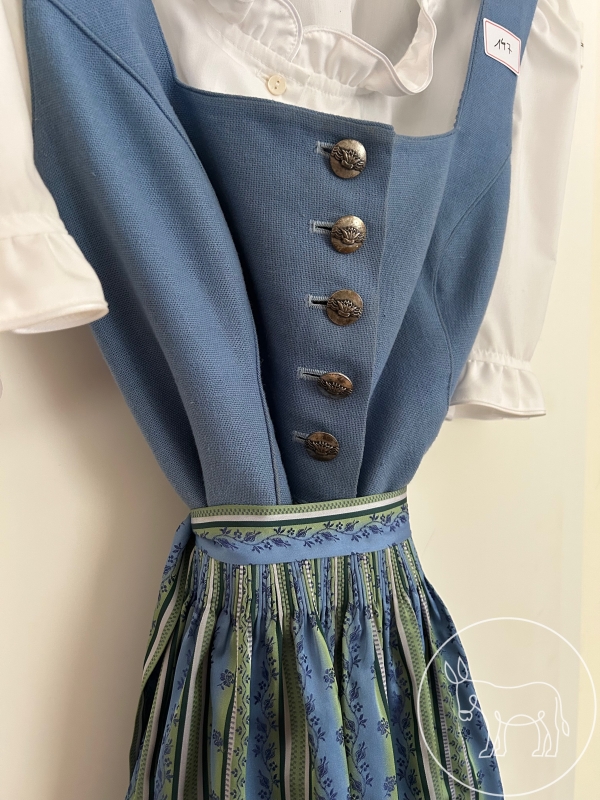 hellblaues Leinendirndl mit dunkelblau geblümtem Rock und blau/grüner Seidenschürze. Mit Rüschenbluse. Dirndl Größe 44.