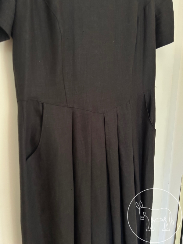 schwarzes Leinenkleid größe 40 (groß geschnitten) mit kurzen Ärmeln, und schrägen Taschen, wadenlang.