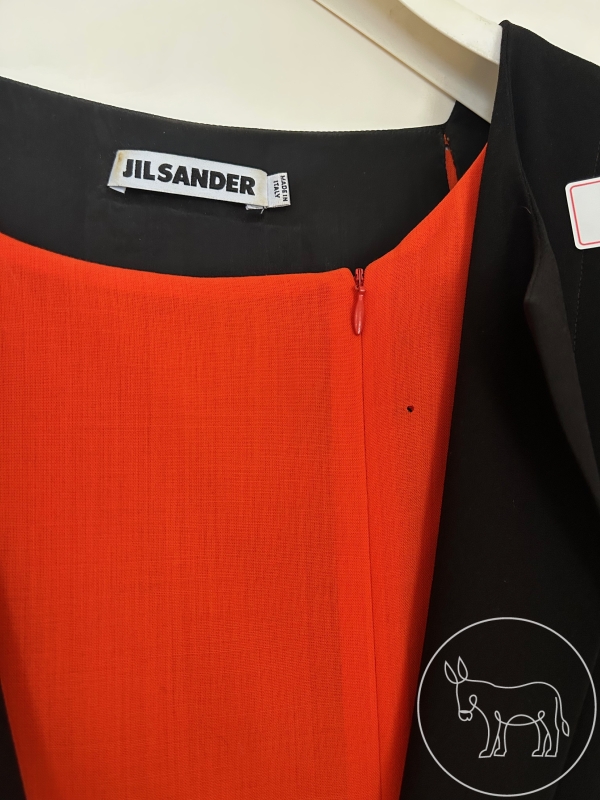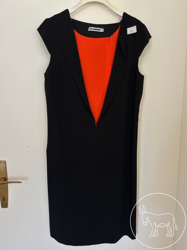 schwares Kleid mit orange eingearbeitetem Oberteil. Coctailkleid. Größe 42. (kleides Loch ober der Brust, kann mit Brosche kaschiert werden).