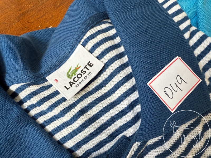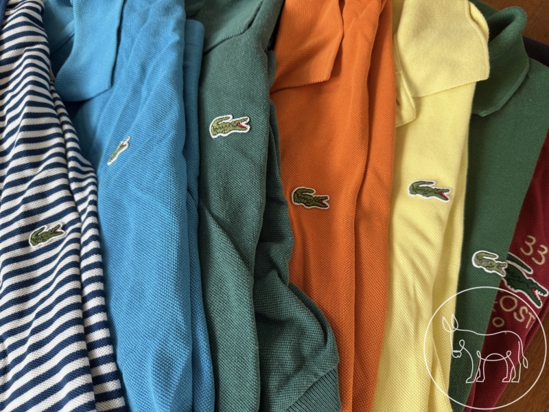 7 Stück Lacoste Polos, Gr. 8, getragen, gewaschen, bordeaux, flaschengrün, gelb, orange, waldgrün, türkis, blau7weiß gestreift, lang- und kurzarm gemischt.