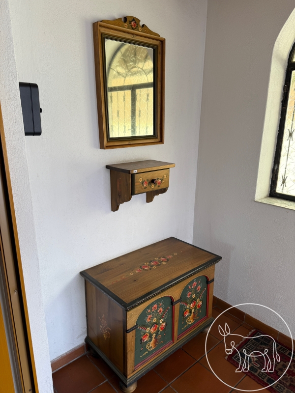 im bäuerlichen Stil. Bestehend aus Truhe (80x77x54cm), Spiegel (69x48cm) und kleinem Regal (37x22x31cm)