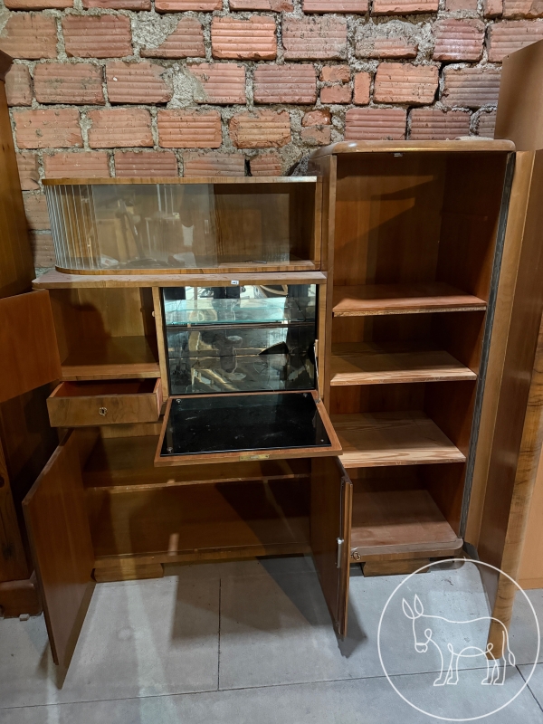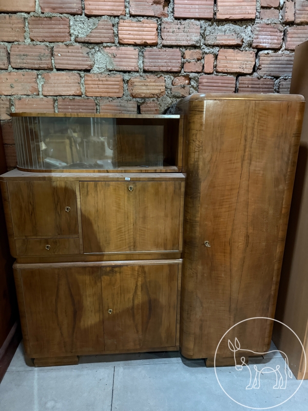 abgerundete Ecken, Glasschiebetüre, diverse kleinere und größere Türen, versperrbar, ein Schlüssel vorhanden, innen verspiegelt. Maß: 156x62x167cm