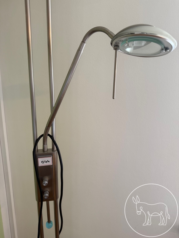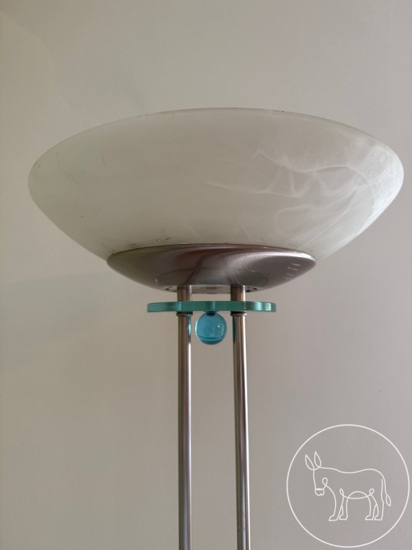 Stehlampe und Leselampe, silber mit weißen Schirmen und hellblauen Details. Höhe: 181cm