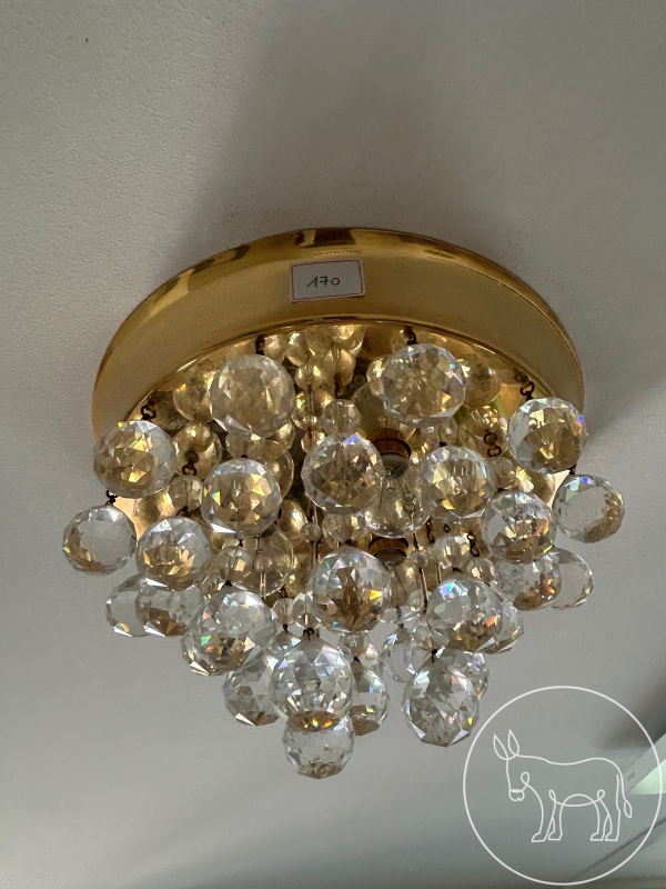 Deckenluster aus Messing mit hängenden Kristall-Kugeln. Durchmesser 30cm.