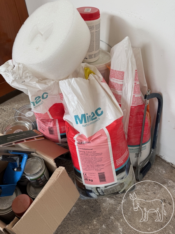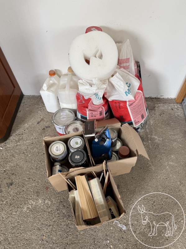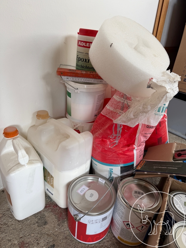 Konvolut aus Maler-Zubehör, Lacke, Farben, Quarzsand, eine Säge, etc.