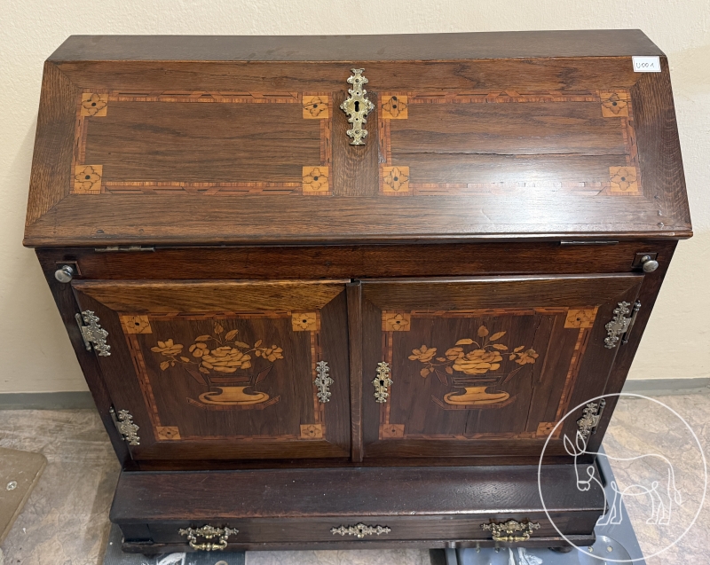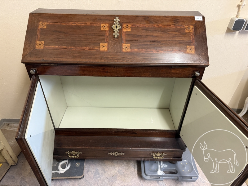 Sekretär mit verschnörkelten Griffen und Beschlägen, 2 Auszugsschienen, auf die die Schreibtischplatte gestützt wird. Maß: 90x40x95cm, Schlüssel fehlt.