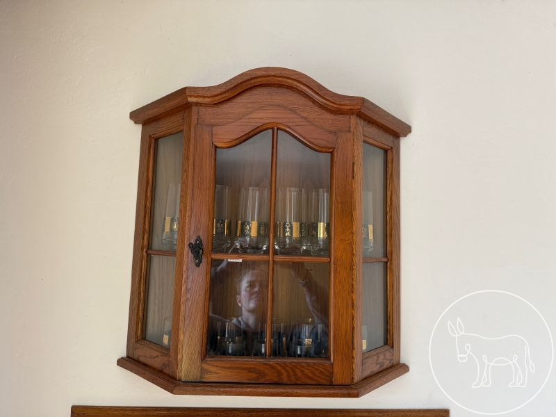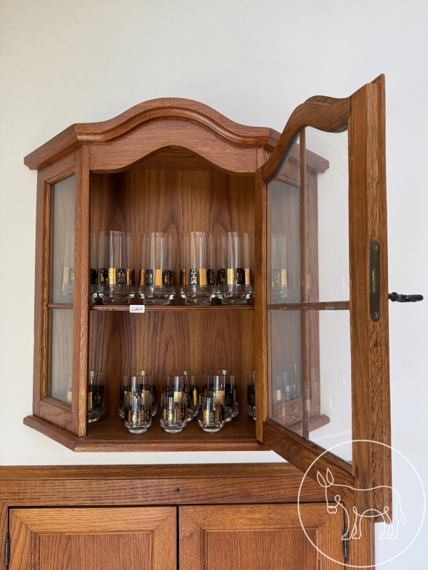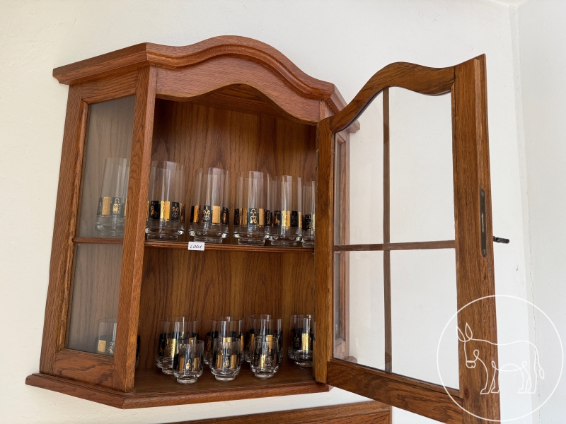Holzwandschrank mit dünnen Gläsern. 6 grtoße Wassergläser, 5 niedrige Wassergläser, 3 Schnapsgläser, alle mit Sternzeichen. 60x53cm Tiefe 16cm