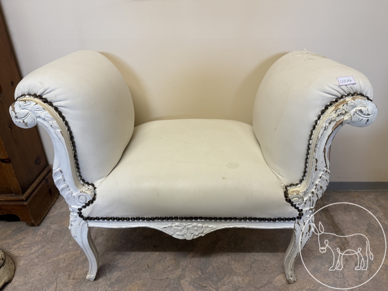 Holz/weiß. Maß: 90x45x70cm, Sitzhöhe 44cm, leicht beschädigt.