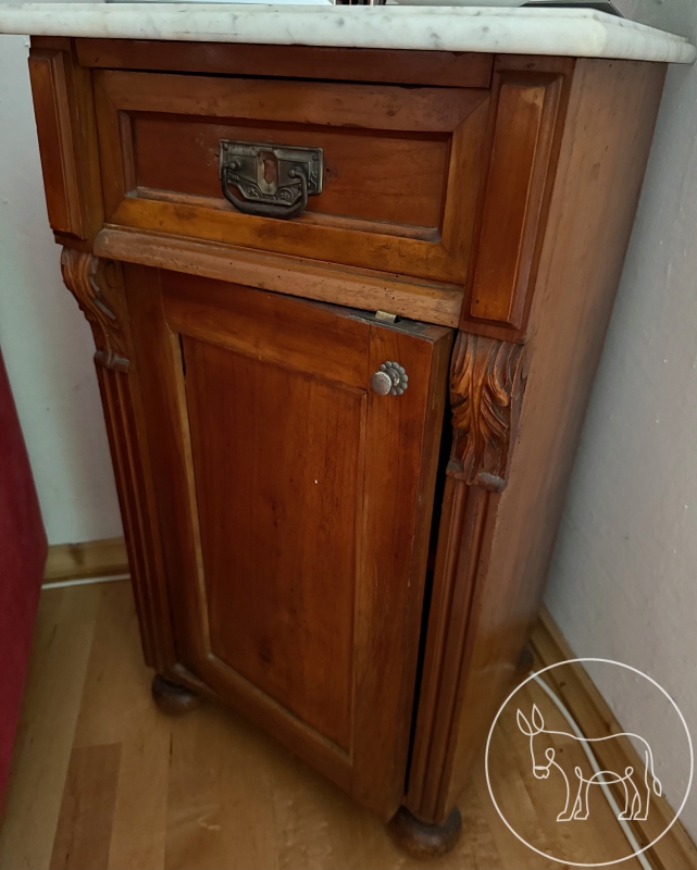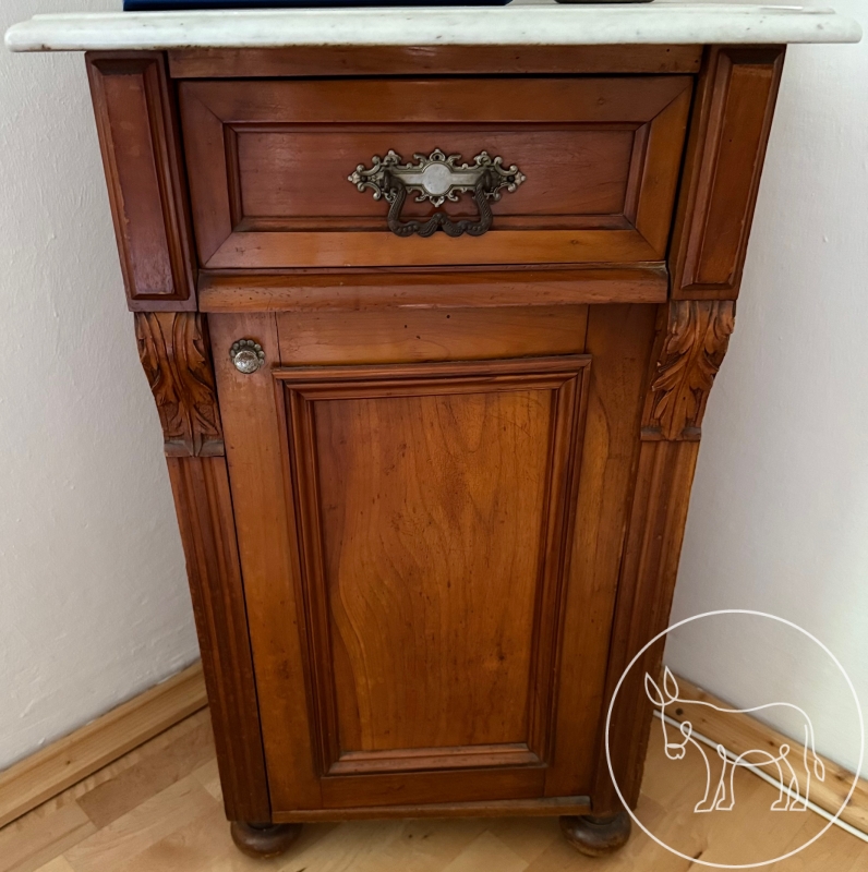 Antike Nachttische mit Marmorplatte, einer Schublade und einer Türe. (ohne Inhalt, ohne Deko). Weit über 100 Jahre alt. Maß: 48x40x80cm