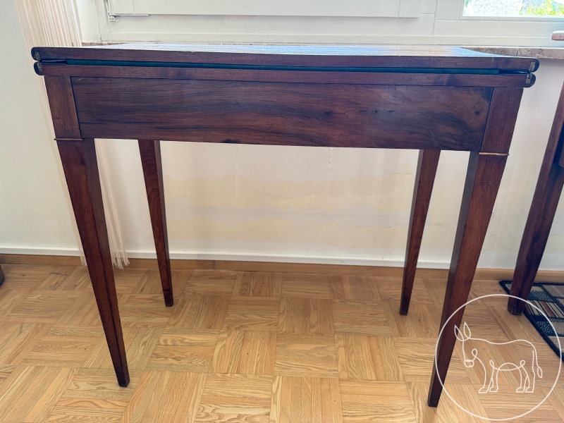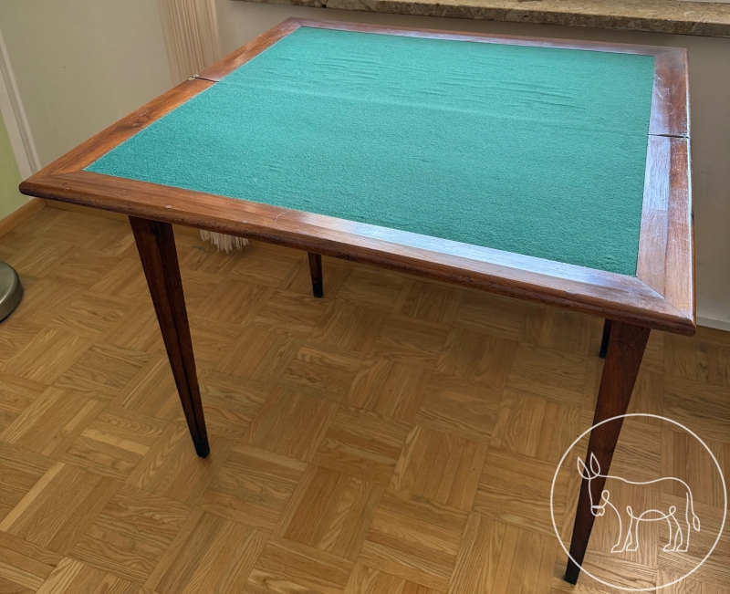 antiker Bridge-Tisch zusammenklappbar mit Filzeinlage auf 4 Füßen (ausziehbar). Ausgeklappt: 80x78cm Zusammengeklappt 39x78. Höhe 74cm.