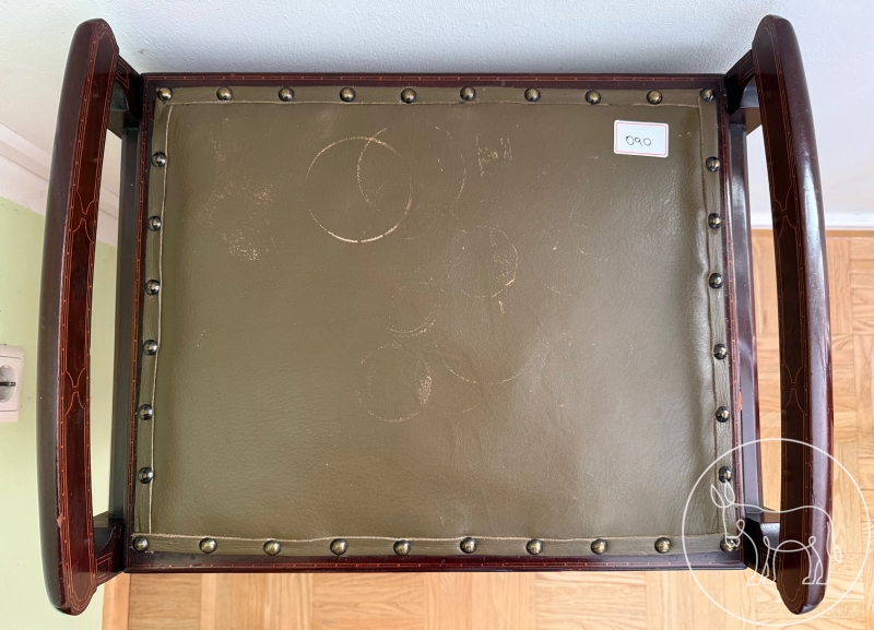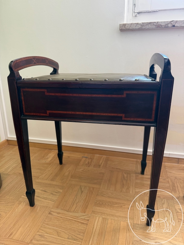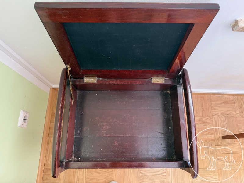 Beistelltisch mit aufklappbarem Deckel und eingearbeiteter Leder-Einlage. Maß: 47x36x52cm