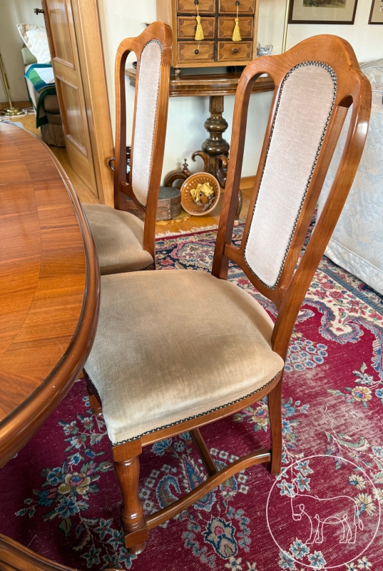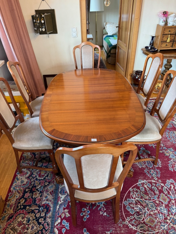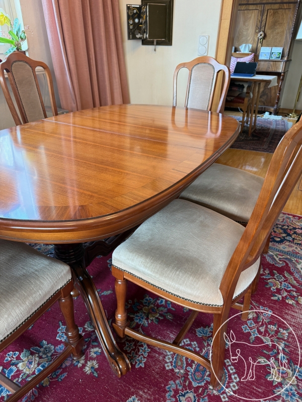 ovaler, ausziehbarer Esstisch (Maß nicht ausgezogen: 160x100cm, kann mit 2 Einschüben mit je 38cm Länge auf gesamt 236cm verlängert werden) mit 6 wunderschön bezogenen, gepolsterten Sesseln. Sehr gut erhalten, keinerlei Gebrauchsspuren.