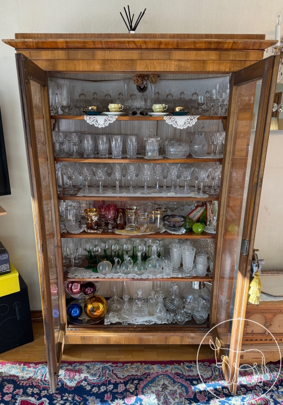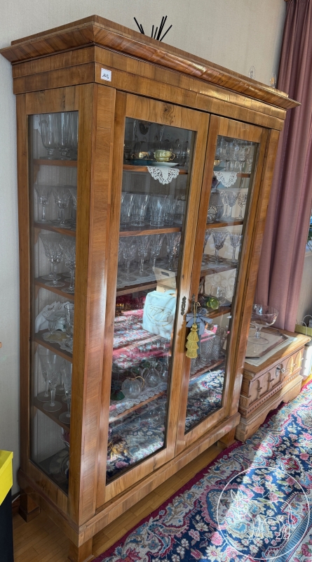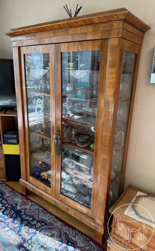 wunderschöner, antiker Biedermeier Glasschrank. Seitlich und vorne voll verglast. Sehr gut erhalten. Mit 5 Einlegeböden. Ohne Inhalt. Maß: 120x44x178cm