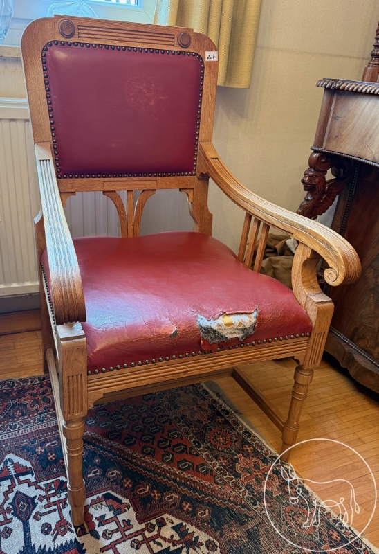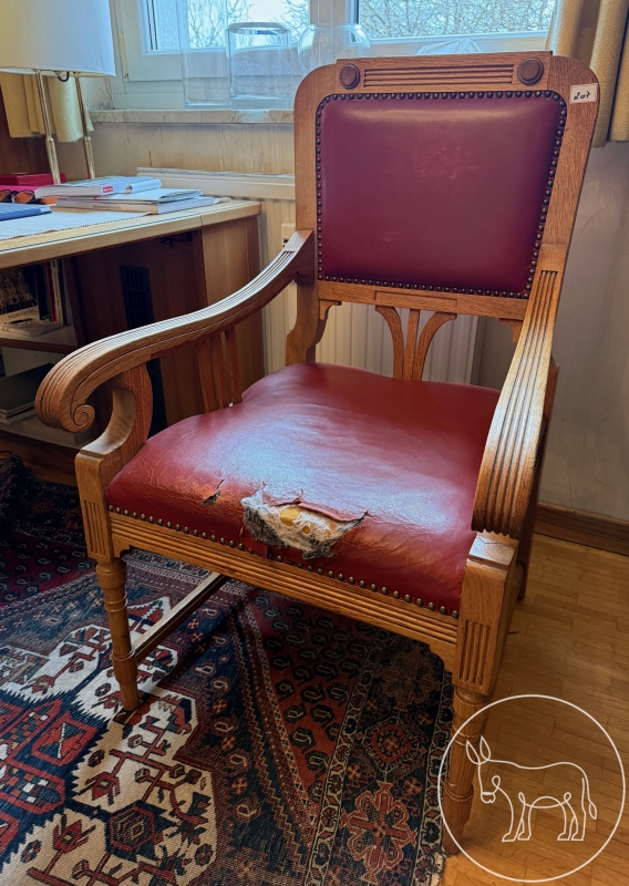 Antiker massiver Holzsessel mit Lederpolsterung (mit Defekt). Sehr bequem, sehr schwer!. Maß: 62x69x102cm. Sitzhöhe 48cm.