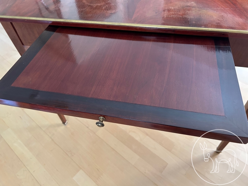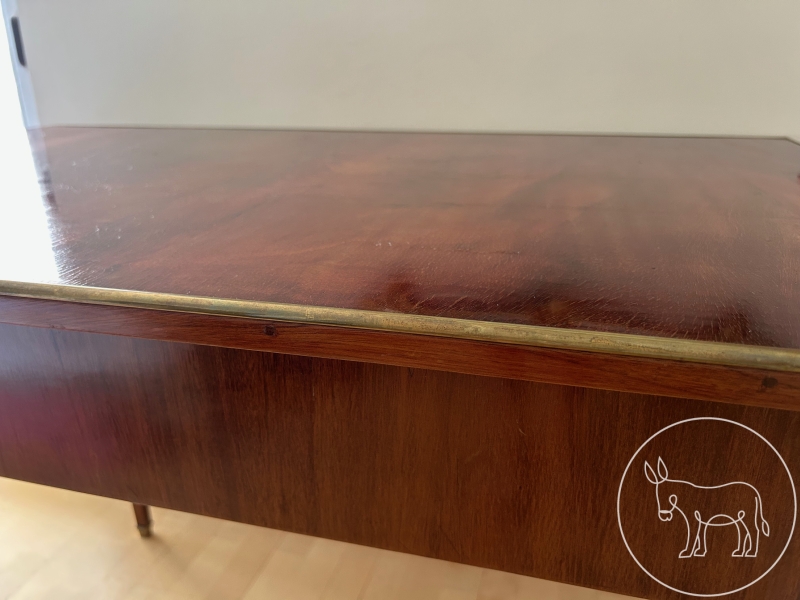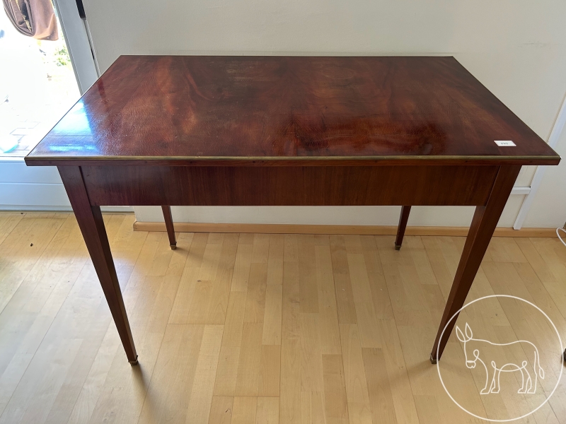 Antiker Holztisch auf schmalen Beinen. Auszug an einer Seite zum Abstellen oder Präsentieren von Dingen. Maß: 110x68x78cm
