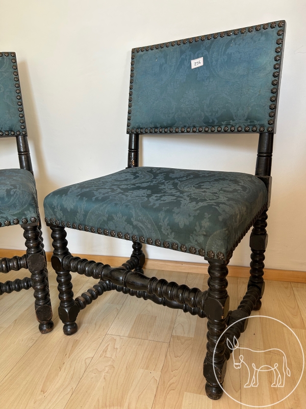 petrolfärbig/gemustert tapeziert, gedrechseltes Holz. Maß: 53x42x85cm, Sitzhöhe 45cm.