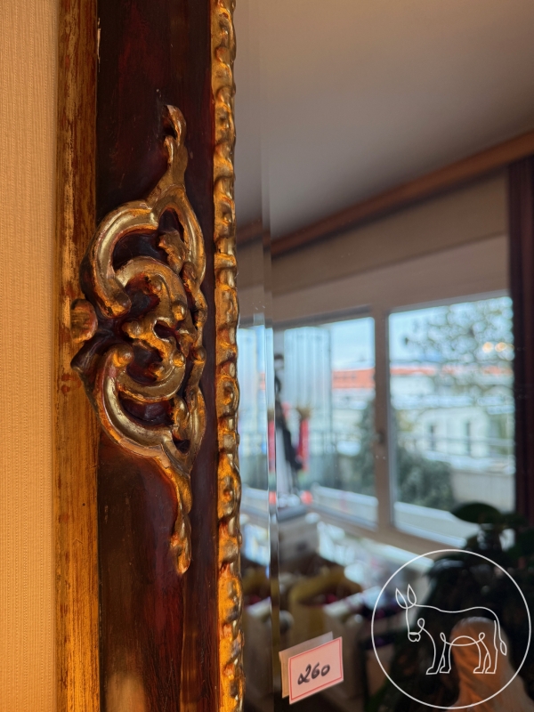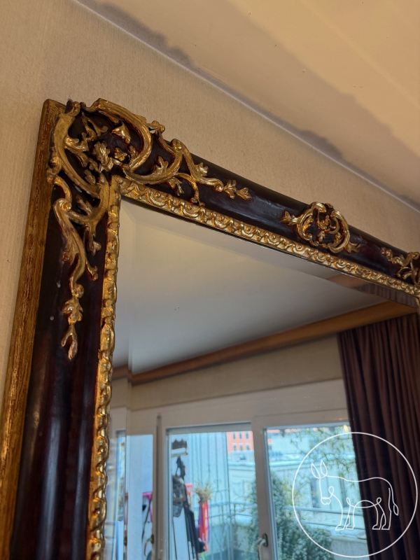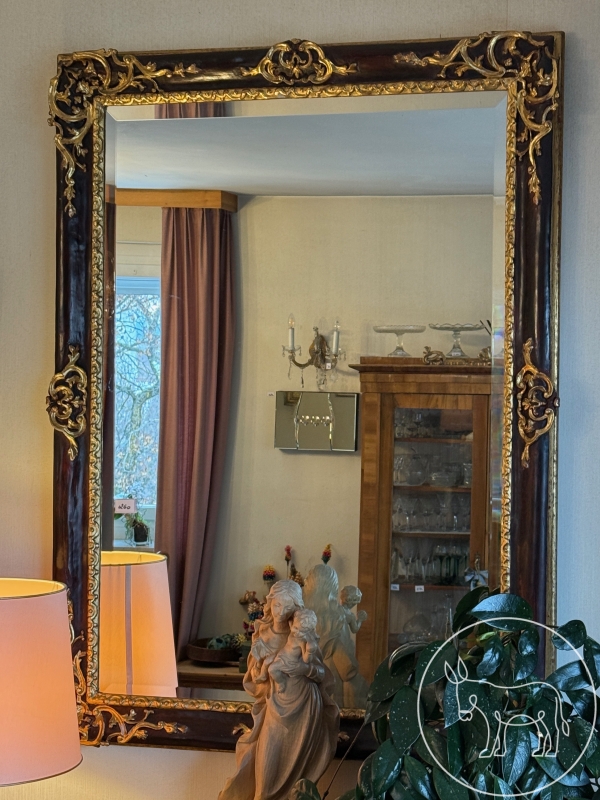Wandspiegel im Barockstil mit reich verziertem, schweren Rahmen. Geschliffenes Glas, Rahmen mit kunstvollen Schnitzereien und floralen Ornamenten. Maß: 123x90cm.