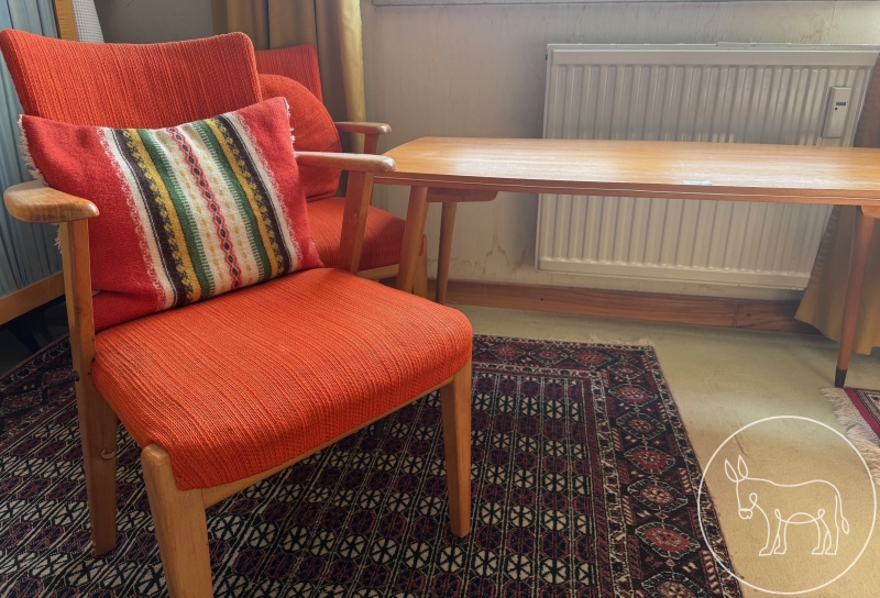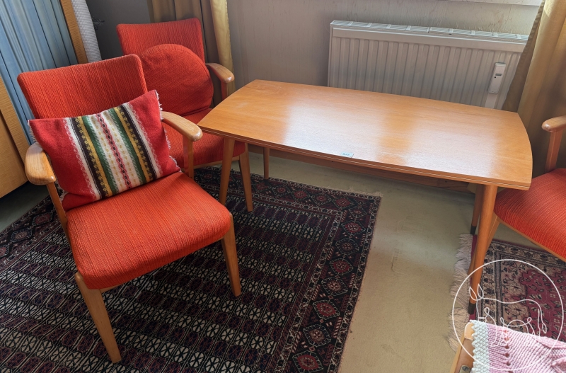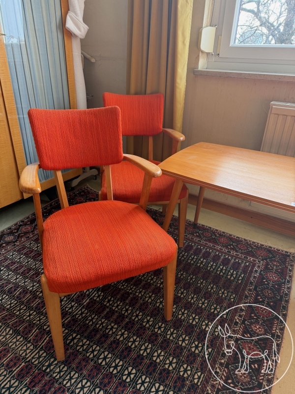 Kleine Sitzgruppe, entworfen in den 50er Jahren. Stoff wurde in den 70er Jahren getauscht. Tisch: 107x55x55cm. Sessel: 50x45x77cm Sitzhöhe 40cm. Mit 2 Zierkissen.