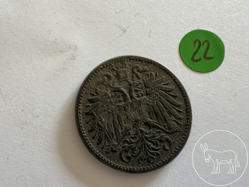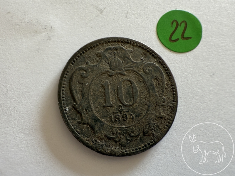 Österreichische 10 Heller Münze, Prägungsjahr 1894, geprägt unter Kaiser Franz Josef I. Die Münzen bestehen aus Nickel und zeigen an der Vorderseite die Wertzahl "10" innerhalb eines Eichenkranzes, darunter das Prägungsjahr. Auf der Rückseite befindet sich der gekrönte, doppelköpfige Wappenadler Österreichs mit Schwert und Reichsapfel und auf seiner Brust das Wappenschild des Hauses Habsburg-Lothringen. Die Münzen wurden während der Regierungszeit von Kaiser Franz Joseph I geprägt.